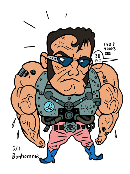 Ça fait un bout que je n'avais rien mis sur le blog (ça faisait un bout que je n'avais pas dessiné pour la peine non plus, ma job de game designer consiste surtout à remplir des feuilles excel de chiffres et formules, c'est cool, mais je m'ennuie de dessiner des fois)... Je me suis amusé un peu avec mon nouveau Tablet PC ce midi. Je viens de découvrir une pointe pour mon stylus Wacom qui rapproche le coup de crayon de celui qu'on fait avec un crayon feutre sur du papier (parce que sinon c'est comme une patinoire, aucune résistance, aucune friction ou presque et c'est pas toujours évident à s'habituer à ça).